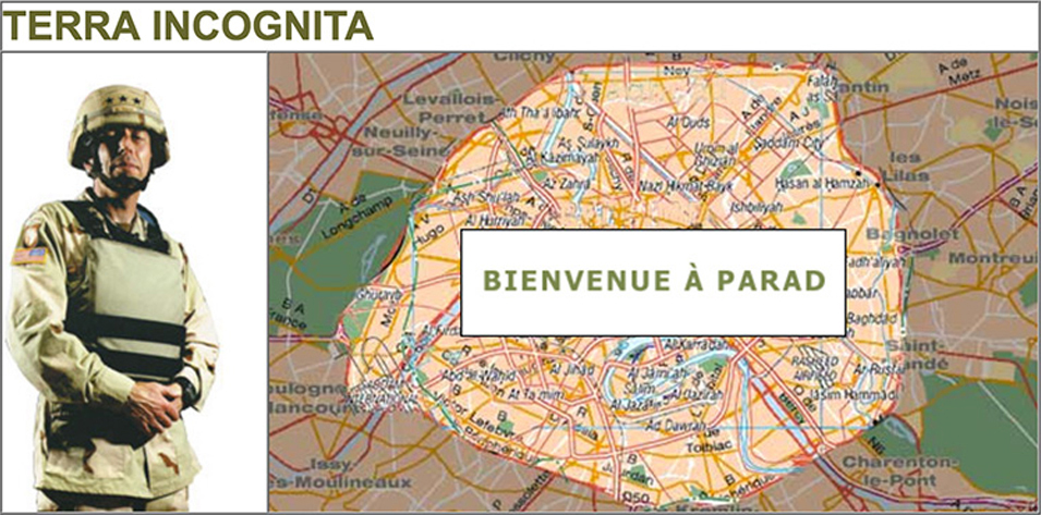 Partant du constat que les frontières géographiques de Paris et de Bagdad sont quasi identiques, Anne Bichon transpose une occupation américaine dans la capitale française.