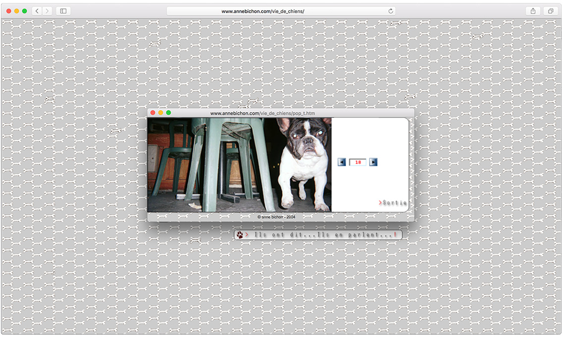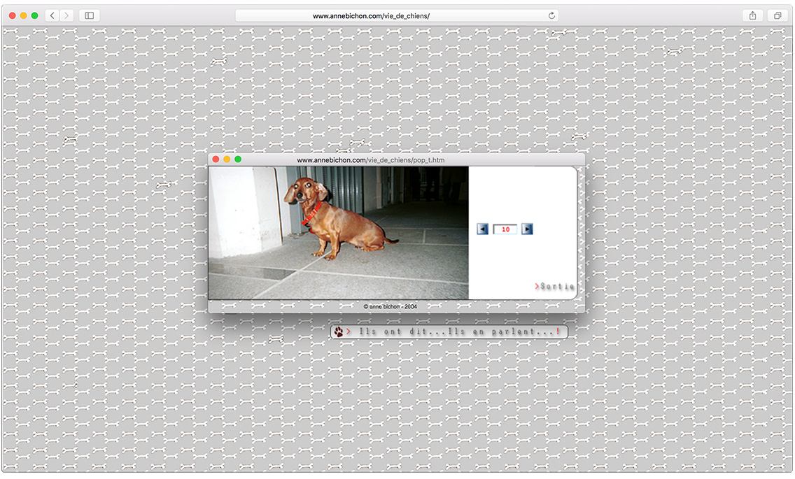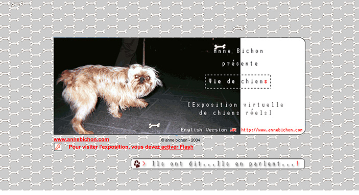 « Vie de chiens - exposition virtuelle de chiens réels » est un dispositif virtuel interactif développé en technologie Flash. Il s’agit de portraits canins photographiés dans la rue selon une méthode. La série qui compte une trentaine de photographies en est l’illustration.