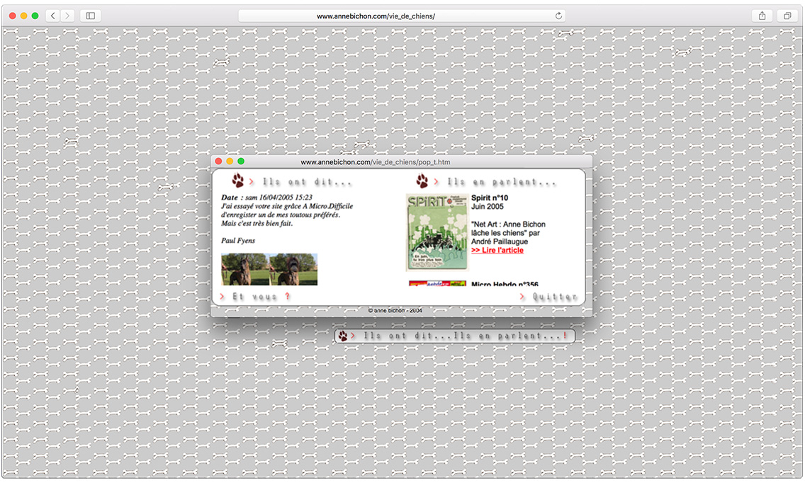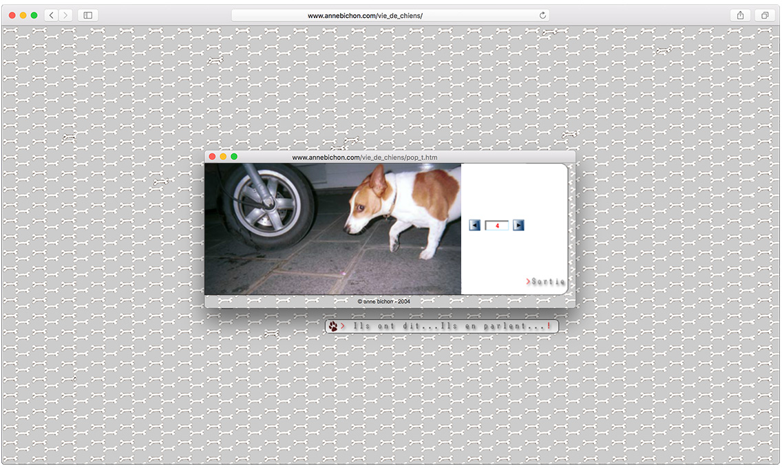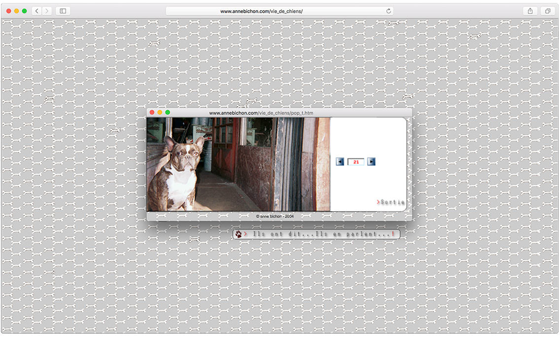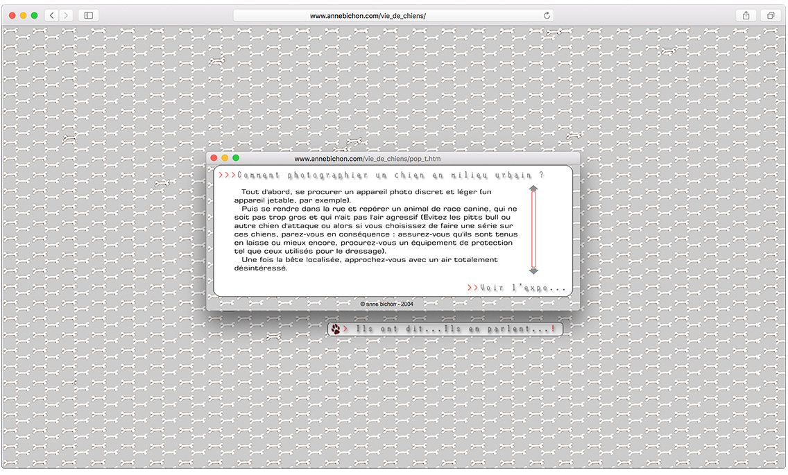 « Vie de chiens - exposition virtuelle de chiens réels » est un dispositif virtuel interactif développé en technologie Flash. Il s’agit de portraits canins photographiés dans la rue selon une méthode. La série qui compte une trentaine de photographies en est l’illustration.